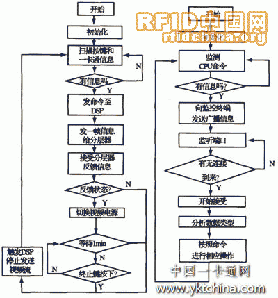 對于底層軟件,主要是門口終端的控制軟件,其工作流程如圖5所示。門口終端上電后,先進行初始化工作,然后開始掃描按鍵和一卡通信息,當(dāng)確認有變化時,微處理器CPU l先給分層器發(fā)送一幀信息,并且監(jiān)聽分層器的反饋信息,同時啟動DSP通過網(wǎng)絡(luò)端口發(fā)送廣播消息給監(jiān)控終端,以便啟動監(jiān)控終端的接受線程接受視頻流和訪問信息或一卡通信息。當(dāng)時間超過l min或終止鍵按下時,雙方終止通信,門口終端與監(jiān)控終端之間由CPU1觸發(fā)DSP中斷,使其停止發(fā)送視頻流數(shù)據(jù)。