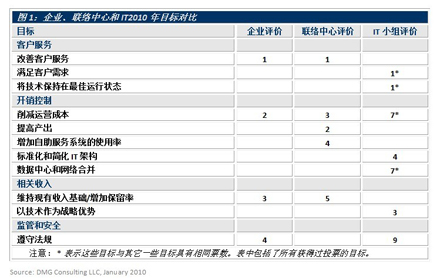 DMG的基準(zhǔn)調(diào)研顯示IT有自己的優(yōu)先級:IT2010年的首要目標(biāo)是滿足商業(yè)客戶的需求并使企業(yè)的技術(shù)和應(yīng)用軟件運(yùn)行在最佳狀態(tài)。這表明IT企業(yè)是帶著強(qiáng)烈的支持企業(yè)客戶目標(biāo)和目的的意愿步入2010年的。但令人失望的是IT企業(yè)并沒有努力去了解他們客戶的目標(biāo)。這種目標(biāo)上的不一致是導(dǎo)致IT和聯(lián)絡(luò)中心之間缺乏信任的主要原因。