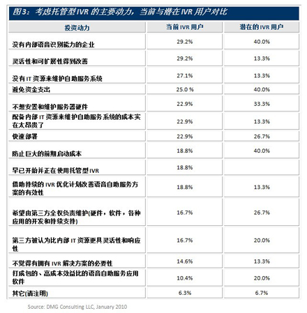 圖3顯示了現(xiàn)有和潛在的語音自助服務(wù)用戶尋求托管型IVR的主要?jiǎng)恿碓。潛在客戶認(rèn)真考慮托管型IVR解決方案的兩個(gè)很明顯的原因是避免大的資金開銷和最小化啟動(dòng)成本,在經(jīng)濟(jì)不景氣時(shí)這樣的做法并不令人意外。另外還有個(gè)原因是希望一邊使用該方案一邊積累經(jīng)驗(yàn)和知識。