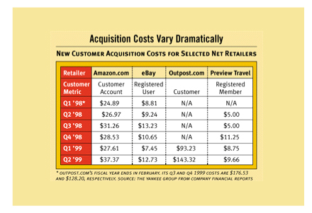 上世紀(jì)90年代末期DOT.COM就遭遇了這一嚴(yán)峻問(wèn)題。70% - 80%的客戶在沒(méi)有完成采購(gòu)之前就棄網(wǎng)站而去。對(duì)于許多人來(lái)說(shuō)這被認(rèn)為是一個(gè)“行業(yè)基準(zhǔn)”,屬于可接受水平,但也有些人開(kāi)始尋找解決方案。整個(gè)行業(yè)開(kāi)始注意到分析家們的忠告:這一水平的放棄率是不被允許的。下面這張由Yankee集團(tuán)在2000年發(fā)布的表格向我們展示了電子商務(wù)企業(yè)客戶獲取成本螺旋形盤升的過(guò)程。