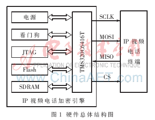 加密引擎以TMS320C6416T為核心,包括SDRAM、Flash、電源、JTAG接口、看門狗等。加密引擎和IP視頻電話終端通過SPI總線通信,硬件總體結(jié)構(gòu)如圖1所示。