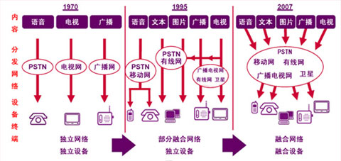 2010年1月13日,國務(wù)院常務(wù)會議決定加快推進(jìn)電信網(wǎng)、廣播電視網(wǎng)和互聯(lián)網(wǎng)三網(wǎng)融合。5年內(nèi)全面實現(xiàn)電信網(wǎng)、廣播電視網(wǎng)和互聯(lián)網(wǎng)三網(wǎng)融合,并明確提出階段性目標(biāo)和重點工作。