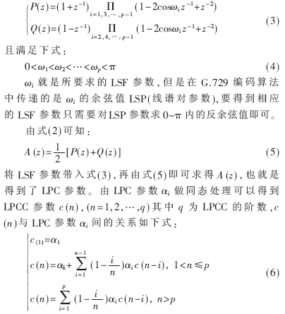本文選擇G.729編碼幀中第一子幀的LSP(1)參數(shù)的反余弦LSF及由其轉(zhuǎn)換得到的LPC、LPCC參數(shù)作為聲道特征參數(shù)。