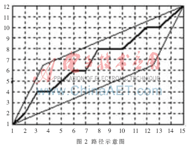 把測(cè)試模版的各個(gè)幀號(hào)n=1,…,N在一個(gè)二維直角坐標(biāo)系的橫軸上標(biāo)出,把參考模版的各幀號(hào)m=1,…,M在縱軸上標(biāo)出,通過(guò)這些表示幀號(hào)的整數(shù)坐標(biāo)畫出的橫縱線即可形成一個(gè)網(wǎng)格,網(wǎng)格中的每一個(gè)交叉點(diǎn)(n,m)表示測(cè)試模版中某一幀與訓(xùn)練模版中某一幀的交叉點(diǎn)。動(dòng)態(tài)規(guī)劃算法可以歸結(jié)為尋找一條通過(guò)此網(wǎng)格中若干格點(diǎn)的路徑,路徑通過(guò)的格點(diǎn)即為測(cè)試和參考模版中距離計(jì)算的幀號(hào)。