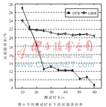 圖4給出基于DTW識(shí)別方法與GMM模型(混元數(shù)64)識(shí)別G.729編碼方案863語(yǔ)料庫(kù)的文本相關(guān)說(shuō)話人的誤識(shí)率對(duì)比圖。橫坐標(biāo)代表的測(cè)試語(yǔ)音的時(shí)長(zhǎng),縱坐標(biāo)代表識(shí)別誤識(shí)率。由實(shí)驗(yàn)結(jié)果可知在文本相關(guān)的說(shuō)話人識(shí)別中,基于DTW算法的識(shí)別率在絕大多數(shù)情況下高于GMM模型,且隨著測(cè)試語(yǔ)音的增長(zhǎng),優(yōu)勢(shì)更明顯。