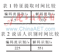 時(shí)間都遠(yuǎn)小于解碼重建后的語(yǔ)音特征提取時(shí)間和識(shí)別時(shí)間,滿足實(shí)時(shí)說(shuō)話人識(shí)別的需要。