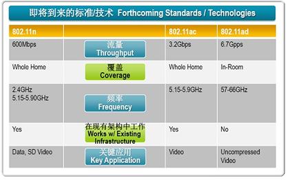 在802.11a/b/g/n等標(biāo)準(zhǔn)不斷刷新更高覆蓋率和數(shù)據(jù)傳輸率的同時(shí),新的標(biāo)準(zhǔn)如802.11ac、802.11ad等都正在嶄露頭角。Michael介紹說(shuō),與802.11n 600Mbps的流量相比,ac和ad的流量將分別高達(dá)3.2Gbps和6.7Gbps,頻率范圍分別為5.15GHz~5.9GHz和57GHz~66GHz。從應(yīng)用角度看,ac會(huì)定位在整個(gè)家居多個(gè)室內(nèi)的多媒體內(nèi)容共享;而ad由于傳輸距離有限,用于單個(gè)居室內(nèi)未壓縮高清視頻的短距離傳輸,即可能會(huì)成為HDMI標(biāo)準(zhǔn)的替代者。
