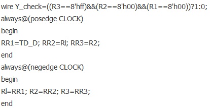 在硬件描述語言中,完成上述過程還是比較簡單的。例如檢測電路,只要描述一個(gè)移位寄存器就可以了,具體代碼如下: