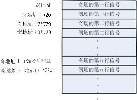 第1種:將一幀的數(shù)據(jù)存儲(chǔ)下來,根據(jù)奇偶場的不同(區(qū)分可以根據(jù)XY),在寫周期的時(shí)候,因?yàn)槠鎴龅男兄g有偶場的信號(hào),所以寫數(shù)據(jù)的時(shí)候需要跳地址寫,根據(jù)行同步信號(hào)(或者SAV也可以)來區(qū)分行,換行的時(shí)候地址要加額外的720(用來存放夾雜在奇場信號(hào)中的偶場信號(hào)),直到出現(xiàn)偶場信號(hào)(也就是XY=1)地址切換為初始基地址加720,其余的同奇行的處理方法,具體的地址分配表參照?qǐng)D4。
