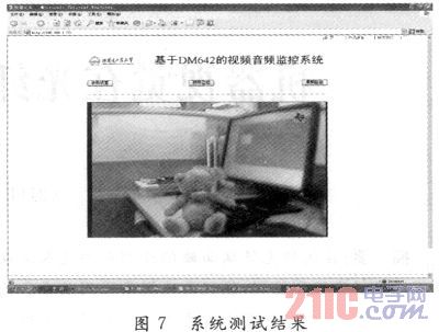 在集成開(kāi)發(fā)環(huán)境CCS(C6000)下,加載相關(guān)驅(qū)動(dòng)程序,對(duì)本系統(tǒng)進(jìn)行了測(cè)試。CCD攝像頭為標(biāo)準(zhǔn)PAL制式,圖像采集的幀頻為25幀/s,圖像的分辨率為720×576像素。測(cè)試結(jié)果如圖7所示。測(cè)試結(jié)果表明,網(wǎng)絡(luò)連接正常,用戶(hù)在PC端可通過(guò)瀏覽器訪問(wèn)系統(tǒng),成功實(shí)現(xiàn)遠(yuǎn)程監(jiān)控。