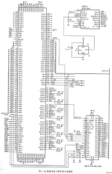BT8474是一個(gè)PCI多功能設(shè)備。本系統(tǒng)中,其功能0實(shí)現(xiàn)鏈路層的控制;功能1完成物理層的控制。BT8474是由1個(gè)主接口、4個(gè)串口、1個(gè)EBUS端口和1個(gè)邊界掃描口構(gòu)成。主接口通過PCI的兩個(gè)功能配置區(qū)找到基地址寄存器,系統(tǒng)根據(jù)訪問的地址值決定選擇的功能;串行接口完成主接口和物理接口器件的數(shù)據(jù)傳輸;EBUS端口通過內(nèi)置的MPU(微處理器單元)來擴(kuò)展外圍設(shè)備,物理接口器件BT8370是一個(gè)T1/E1收發(fā)成幀器,可支持LineRate為1.544 Mb/s(T1)或者2.048 Mb/s(E1)的收發(fā)接口。物理線性接口電路恢復(fù)來自于電纜的“+3 dB~-43 dB”的模擬時(shí)鐘和數(shù)據(jù)。圖1給出了E1數(shù)據(jù)采集卡硬件設(shè)計(jì)原理圖。
