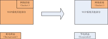 2、程序配置用于 VOIP 業(yè)務(wù)的網(wǎng)絡(luò)連接(Socket),告知系統(tǒng),在程序進(jìn)程被調(diào)度到“掛起(Suspended)”狀態(tài)時該特殊的網(wǎng)絡(luò)連接需要被系統(tǒng)接管,因此,此時網(wǎng)絡(luò)連接仍然是活動的。當(dāng)網(wǎng)絡(luò)連接有新的數(shù)據(jù)到達(dá)的時候,程序?qū)摹皰炱穑⊿uspended)” 狀態(tài)被喚醒到“后臺 (Background)”狀態(tài),如果是個來電事件,VOIP應(yīng)用則發(fā)起一個本地提醒事件,此時用戶可以在設(shè)備的界面上看到來電提醒,如果用戶選擇接聽來電,則 VOIP 應(yīng)用被調(diào)度到前端的“活動 (Active)”狀態(tài)直接與用戶交互,否則,回退到低電的“掛起(Suspended)”狀態(tài)。下圖可以看到左圖是傳統(tǒng)的 VOIP 應(yīng)用,在“待機(jī)”狀態(tài)下整個程序都運(yùn)行在耗電的“后臺 (Background)”狀態(tài),右圖是蘋果的 VOIP 實(shí)現(xiàn),僅僅網(wǎng)絡(luò)連接運(yùn)行在耗電的“后臺 (Background)”狀態(tài)。其余系統(tǒng)部分運(yùn)行在低電的“掛起(Suspended)”狀態(tài)。