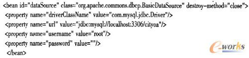 與本地開發(fā)不同的是云計(jì)算平臺下,由于服務(wù)器采用虛擬主機(jī)技術(shù),無法像本地服務(wù)器那樣配置數(shù)據(jù)庫連接池,因此需要CRM系統(tǒng)自己管理數(shù)據(jù)庫連接池。本系統(tǒng)使用Spring管理下的數(shù)據(jù)庫連接池,運(yùn)用Apache開源DBCP框架配置連接池代碼如下: