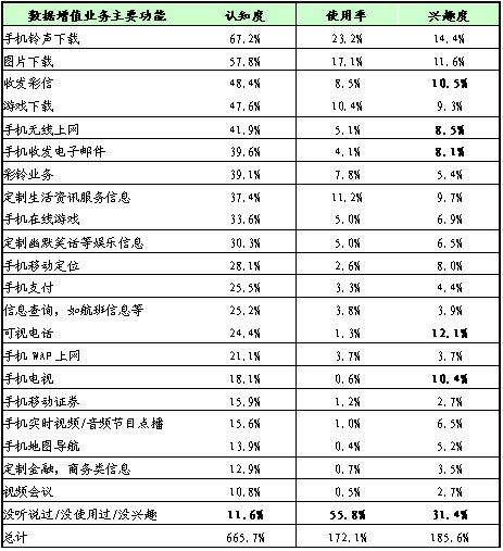 興趣度:手機鈴聲下載、可視電話、圖片下載、收發(fā)彩信、手機電視、定制生活資訊服務信息(新聞、天氣預報等)、游戲下載、手機無線上網(wǎng)等