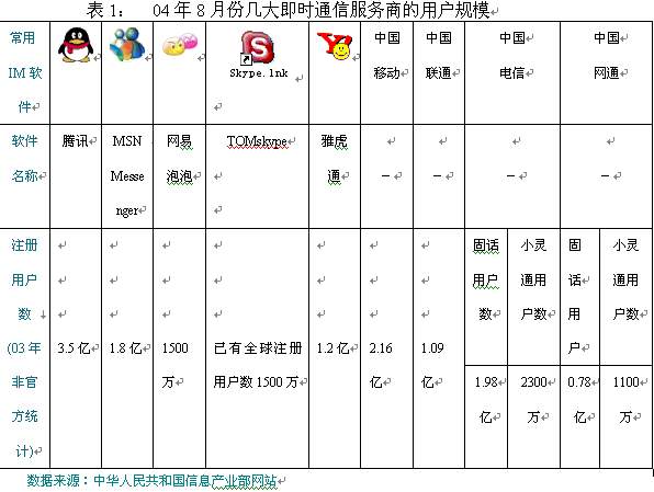 11月16日,TOM在線和歐洲行業(yè)巨頭Skype在京聯(lián)手推出聊天工具TOM-Skype,此業(yè)務(wù)的出現(xiàn),立即在即時通信市場上掀起了軒然大波。其清晰的話音質(zhì)量,簡潔方便的操作界面,擁有來自165個國家1500多萬的全球用戶,在極短的時間內(nèi)就吸引到了大量的中國用戶,更讓基礎(chǔ)運營商感到不安的是skype強大的語音聊天功能將可能大大改變傳統(tǒng)電信的使用習(xí)慣;而與此同時,現(xiàn)有的QQ,POPO等國內(nèi)即時通信工具也早已開展了語音聊天功能,只是苦于目前話音質(zhì)量不盡理想而已。面對眾多虛擬運營商現(xiàn)實和潛在威脅,幾大基礎(chǔ)運營商選擇先下手為強,進入“即時通信”市場的戰(zhàn)略也就不足為怪了。
