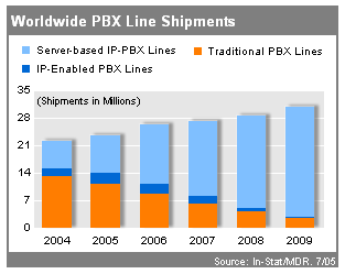 據(jù)In-Stat報(bào)告說,隨著IP線路出貨量今年有望超過傳統(tǒng)PBX,IP PBX進(jìn)入了一個(gè)新的成熟階段。雖然整個(gè)PBX市場(chǎng)預(yù)計(jì)將以6.6%的復(fù)合年增長率增長至2009年,但傳統(tǒng)PBX正在迅速下滑,IP PBX勢(shì)頭越來越強(qiáng)。
