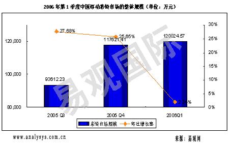 新華美通消息:易觀國際研究表明,2006年第一季度,CRBT 業(yè)務(wù)整體市場規(guī)模達(dá)到16億元,環(huán)比增長率為5%,增長速度較上個季度大幅度下降,業(yè)務(wù)已經(jīng)進(jìn)入低級飽和期。其中中國移動的彩鈴業(yè)務(wù)的市場規(guī)模環(huán)比增長率僅僅為2%,如果扣除中國移動和中央電視臺合作進(jìn)行的春晚彩鈴業(yè)務(wù)收入,中國移動彩鈴業(yè)務(wù)市場規(guī)模實際略有下降。