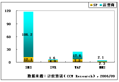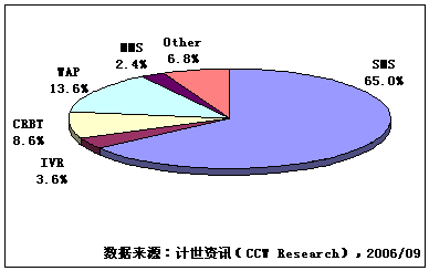 計世資訊(CCW Research)數(shù)據(jù)顯示,2006年第二季度,移動增值業(yè)務(wù)市場規(guī)模達(dá)到182億元人民幣,移動增值業(yè)務(wù)指依托移動通信網(wǎng)絡(luò)所提供的基本服務(wù)而開展的增值數(shù)據(jù)業(yè)務(wù)服務(wù),市場規(guī)模包括移動運營商和服務(wù)提供商(SP)收入。其中SMS、IVR、CRBT、WAP和MMS市場規(guī)模分別為118.3、6.5、15.7、24.8和4.4億元人民幣,其他移動增值業(yè)務(wù)市場規(guī)模12.3億元人民幣,包括JAVA、BREW、移動定位等業(yè)務(wù)。