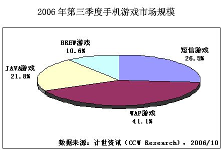 計世資訊(CCW Research)數(shù)據(jù)顯示,2006年第三季度中國手機(jī)游戲市場規(guī)模達(dá)到6.7億元人民幣,比第二季度增長11.9%。 手機(jī)游戲市場規(guī)模包括移動運(yùn)營商、手機(jī)游戲服務(wù)提供商在手機(jī)游戲業(yè)務(wù)上的總體收入,但不包括手機(jī)游戲軟件開發(fā)商的收入。第三季度,短信游戲增速繼續(xù)放緩,短信游戲市場規(guī)模達(dá)到1.8億元,占手機(jī)游戲市場份額的26.5%。WAP,JAVA和BREW游戲繼續(xù)保持快速增長,第三季度WAP、JAVA和BREW游戲市場規(guī)模分別為2.8億元、1.4億元和0.7億元。