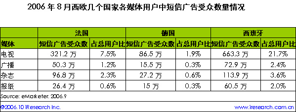 iResearch艾瑞市場咨詢根據(jù)eMarketer資料整理顯示,短信廣告在西歐國家大行其道,成百上千萬的移動用戶訂閱了廣告短信。西歐各國不同媒體訂閱廣告短信的用戶數(shù)不盡相同。總體上來看,西班牙的短信廣告受眾最多,電視用戶中有21.7%人訂閱了短信廣告,數(shù)量達(dá)663.3萬。相比之下,法國電視用戶中的短信廣告受眾只有西班牙的1/2,德國則更少。