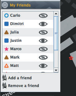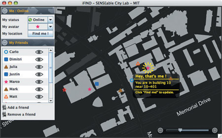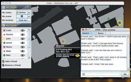該軟件名為iFind,乍一看類似任何典型的即時通信軟件,也需要雙方相互邀請,這樣才能進入對方的好友名單。用戶可以選擇暫時隱藏起來,不讓某個好友或者整個群組看見自己,他們還可以完全把某人從好友名單中刪除。不過iFind的好友名單增加了地圖,可以實時顯示這些朋友在MIT校園的哪個角落。地圖顯示了通過Wi-Fi登錄到MIT網(wǎng)絡(luò)上的好友,讓用戶可以為每個朋友創(chuàng)建獨特的迷你頭像,能看到誰在學校河邊閑逛、誰在樓上圖書館看書。