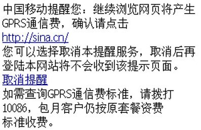 從2007年5月17日起,通過手機(jī)訪問WAP網(wǎng)站,中國移動向用戶主動提供一個收費(fèi)提示頁面,提醒用戶“正在使用手機(jī)上網(wǎng)業(yè)務(wù),若繼續(xù)瀏覽網(wǎng)頁,將會產(chǎn)生GPRS通信費(fèi)”。但打開中國移動夢網(wǎng)頁面,則不會有上述提示。