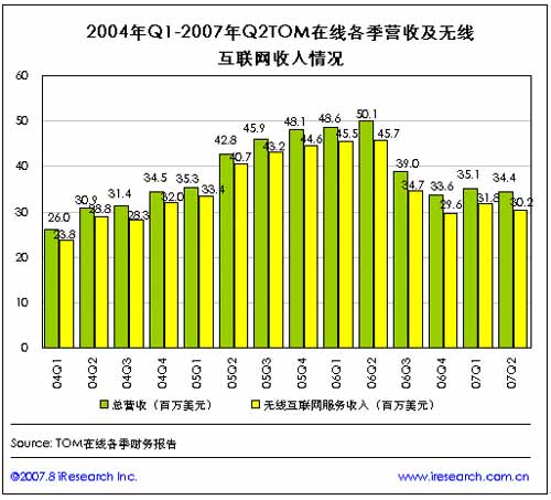在2006年第二季度總營(yíng)收以及無線互聯(lián)網(wǎng)服務(wù)收入分別達(dá)到歷史最高點(diǎn)(分別達(dá)到5010萬美元和4571萬美元)之后,TOM在線各季收入及無線互聯(lián)網(wǎng)收入呈逐季下滑趨勢(shì),至2007年第二季度,TOM在線的總營(yíng)收為3439萬美元,來自無線互聯(lián)網(wǎng)服務(wù)的收入為3024萬美元!