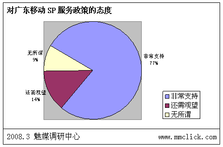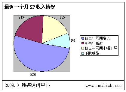 最近公布的空中網(wǎng)財務報表的數(shù)據(jù)顯示空中網(wǎng)總收入環(huán)比增長,結合之前廣東移動推出:廣東移動向重服務轉變 首推“6+1”服務,SP行業(yè)可以說是暖風頻吹。魅媒無線行業(yè)調(diào)研中心隨機從3月3日到3月5日隨記電話采訪50多家全網(wǎng)以及廣東省網(wǎng)SP公司相關負責人,對最近的SP行業(yè)的政策調(diào)整進行調(diào)查,有以下的數(shù)據(jù):