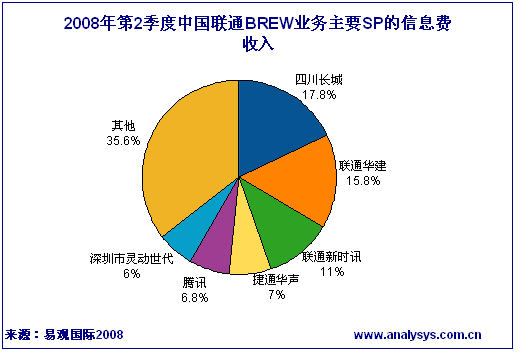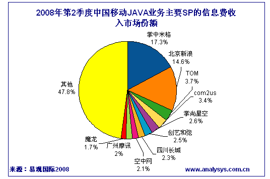 易觀國際近期發(fā)布《2008年第2季度中國手機游戲市場季度監(jiān)測》顯示:中國移動JAVA業(yè)務SP信息費方面,掌中米格、北京新浪分居前兩名,兩者市場占有率已提高至31.9%。其中掌中米格信息費季度收入達到2505.86萬元,市場占比為17.3%,而新浪信息費收入市場占比為14.6%。信息費收入的第3至第5名依次為TOM、com2us、掌尚星空,三者總市場占比為9.7%。