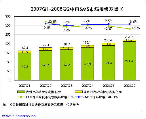 08Q3中國短信市場規(guī)模將繼續(xù)保持增長,非點(diǎn)對點(diǎn)業(yè)務(wù)下滑放緩