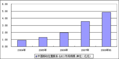 圖 1 2003-2008年上半年中國移動(dòng)位置服務(wù)(LBS)市場規(guī)模