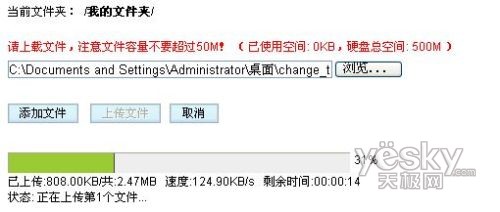 相對而言189在網(wǎng)絡(luò)硬盤功能方面則優(yōu)越很多,除了硬盤空間的容量外,支持上傳文件的進度條顯示,而且上傳速率也不錯,基本穩(wěn)定保持在120KB/s。