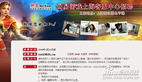 網(wǎng)易表示,招聘將從2009年4月21日起正式開始,將提供優(yōu)厚的待遇、完善的福利及勞動(dòng)保障。截至21日0時(shí),該頁面顯示網(wǎng)易已接收到6048份簡(jiǎn)歷。