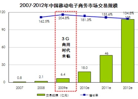 根據艾瑞咨詢即將發(fā)布的《2008-2009年中國移動電子商務行業(yè)發(fā)展報告》數據表明,08年中國移動電子商務市場交易規(guī)模為2.1億元,09年隨著3G商用時代到來,以及無線與傳統(tǒng)電子商務企業(yè)的紛紛試水,預計交易規(guī)模將達6.4億,同比增長約205%。艾瑞預計2012年移動電子商務交易規(guī)模將達到108億元,發(fā)展?jié)摿薮蟆?br />
