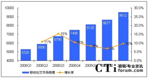 CTI論壇(ctiforum)12月8日消息(記者 楊悅):馳昂咨詢(Sinotes)發(fā)布的《2009年中國(guó)移動(dòng)互聯(lián)網(wǎng)業(yè)務(wù)市場(chǎng)監(jiān)測(cè)-第三季度》報(bào)告數(shù)據(jù)顯示,2009年Q3中國(guó)移動(dòng)社交業(yè)務(wù)市場(chǎng)規(guī)模才超過(guò)9000萬(wàn)元,達(dá)9512萬(wàn)元,直逼億元大關(guān)。與2009年Q2相比,增長(zhǎng)率達(dá)10%。預(yù)計(jì)其年增長(zhǎng)率將超過(guò)30%。