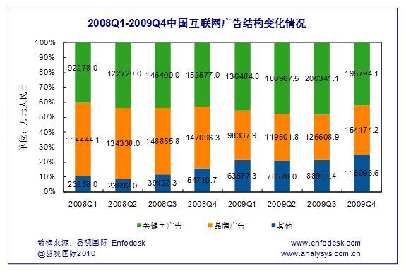 品牌廣告則繼續(xù)保持上升趨勢,2009年第4季度,其市場規(guī)模達(dá)到15.4億元,環(huán)比增長21.8%,同比小幅上升4.8%。增長來源主要是快消品、互聯(lián)網(wǎng)產(chǎn)品及服務(wù)以及汽車、通訊行業(yè)等。