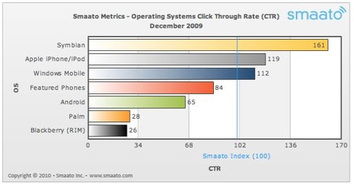 Smaato的數(shù)據(jù)顯示,將所有手機平臺的移動廣告平均點擊率設為100分,那么Symbian的得分高達161分,排名第一,遙遙領先于得分119、排名第二的iPhone,而Android得分僅65。比Android更差的是Palm和黑莓手機。