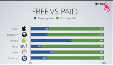 業(yè)內(nèi)人士認(rèn)為,之所以出現(xiàn)這種情況,或許是因為谷歌最早只面向免費應(yīng)用開放Android應(yīng)用商店,后來才允許開發(fā)人員推出付費應(yīng)用。蘋果和黑莓的免費應(yīng)用比例比較接近,分別為25%和24%。此外,Palm的這一比例為32%,Windows Mobile為22%,諾基亞Ovi為15%。
