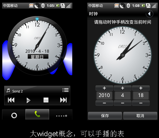 第三,引入大widget概念。Widget給用戶提供了簡易接口來執(zhí)行一些常用功能。OPhone2.0版本首次引入了大widget概念,將手機人性化操作提升到了新的高度。譬如,手機最簡單也是最常用的顯示時間功能,就在OPhone2.0中被設計成了一個“可以用手播動的表”,用戶不必再繁瑣地輸入數(shù)字來修改時間。