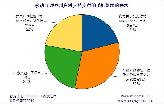 據(jù)Enfodesk易觀智庫最新報告《中國移動互聯(lián)網(wǎng)市場用戶研究報告2010》研究發(fā)現(xiàn),目前在移動互聯(lián)網(wǎng)用戶中,有75%的用戶對具有移動支付功能的手機(jī)表現(xiàn)出明顯的興趣,其中影響不大,完全靠性價比決定是否購買的用戶占比最多,約為32%,只有在移動具備支付功能的手機(jī)和可接受價格相近時才會購買。另外21%的人由于對移動支付業(yè)務(wù)需求程度較高,愿意為此付出更高價格,其他22%的用戶則在比同性能手機(jī)價格低些之后,才會進(jìn)行消費。除此之外,還有25%的用戶對于具備支付功能的手機(jī)沒有絲毫興趣,不愿意購買。