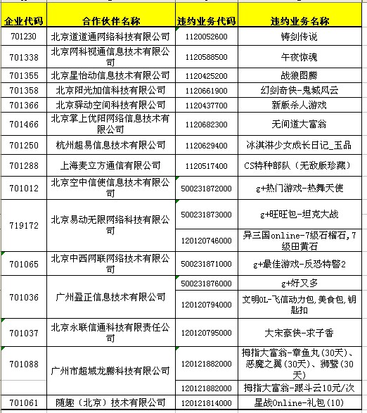依據(jù)省移動(dòng)公司上報(bào)調(diào)查發(fā)現(xiàn),下列合作伙伴存在違約行為,依據(jù)《中國(guó)移動(dòng)游戲業(yè)務(wù)合作伙伴信用積分管理辦法V2.0》,處理如下: