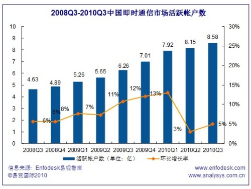 2010Q3中國即時(shí)通信市場活躍帳戶數(shù)超過8.58億