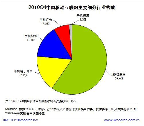 根據(jù)艾瑞咨詢即將發(fā)布的2010年第四季度中國移動互聯(lián)網(wǎng)市場監(jiān)測數(shù)據(jù)顯示,2010Q4中國移動互聯(lián)網(wǎng)市場整體規(guī)模達(dá)到51.1億,同比增長19.8%,環(huán)比增長20.3%。艾瑞咨詢分析認(rèn)為,本季度電信運營商對計費通道治理開始收尾,移動增值市場整體復(fù)蘇。同時手機電子商務(wù)、手機游戲業(yè)務(wù)領(lǐng)域取得良好市場表現(xiàn),受手機應(yīng)用商店、位置簽到服務(wù)等新型手機業(yè)務(wù)創(chuàng)新的帶動,移動互聯(lián)網(wǎng)規(guī)?傮w攀升,投融資比重增加。