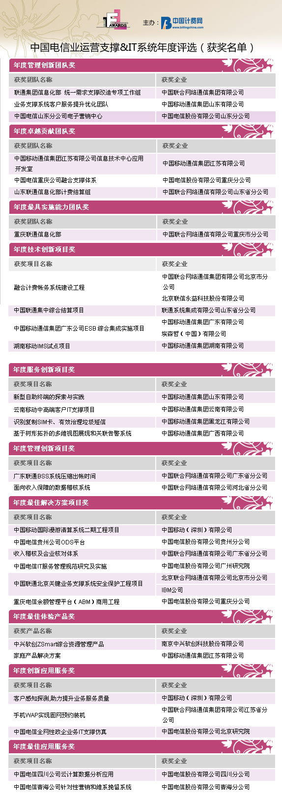 由中國(guó)計(jì)費(fèi)網(wǎng)(www.billingchina.com)主辦的“Awards2010”第四屆中國(guó)電信業(yè)運(yùn)營(yíng)支撐&IT系統(tǒng)年度評(píng)選活動(dòng)的結(jié)果于2011年元月31日隆重揭曉。自2010年12月1日評(píng)選活動(dòng)正式啟動(dòng)以來(lái),歷時(shí)兩個(gè)月,來(lái)自國(guó)內(nèi)運(yùn)營(yíng)商集團(tuán)、省級(jí)公司、IT產(chǎn)品與服務(wù)提供商的42家企業(yè)的優(yōu)秀產(chǎn)品、項(xiàng)目和團(tuán)隊(duì)共計(jì)70份參評(píng)項(xiàng)目入圍評(píng)選。經(jīng)過(guò)全面征集、選拔、初審以及評(píng)委團(tuán)的嚴(yán)格評(píng)審,評(píng)選結(jié)果已經(jīng)公示。在30位來(lái)自運(yùn)營(yíng)商IT支撐、業(yè)務(wù)和服務(wù)部門的威權(quán)評(píng)委們的認(rèn)真評(píng)審后,共有27家企業(yè)分別獲得了30個(gè)Awards2010的團(tuán)隊(duì)/項(xiàng)目/產(chǎn)品/應(yīng)用服務(wù)的榮譽(yù)桂冠。