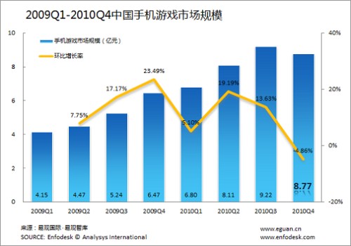 2010年Q4手機游戲市場規(guī)模8.77億首次出現(xiàn)負(fù)增長