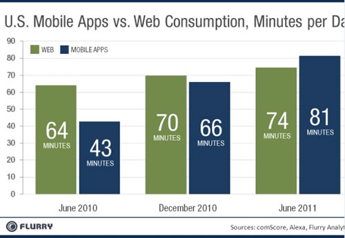 Flurry發(fā)現(xiàn)平均每用戶花在移動應(yīng)用上的時間比網(wǎng)絡(luò)多出9%。僅在1年前,用戶平均每天在應(yīng)用上花費(fèi)43分鐘,在網(wǎng)絡(luò)上花費(fèi)64分鐘。而現(xiàn)在,用戶在應(yīng)用上的時間增至81分鐘,增幅達(dá)91%。原因為用戶使用的應(yīng)用類型和數(shù)量增加,而非平均時長有大幅增加;ㄔ诰W(wǎng)絡(luò)上的時間增速較緩,目前為74分鐘,同比增長16%。