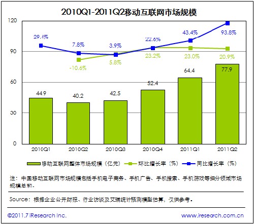2011Q2中國移動互聯(lián)網(wǎng)市場規(guī)模達(dá)77.9億元