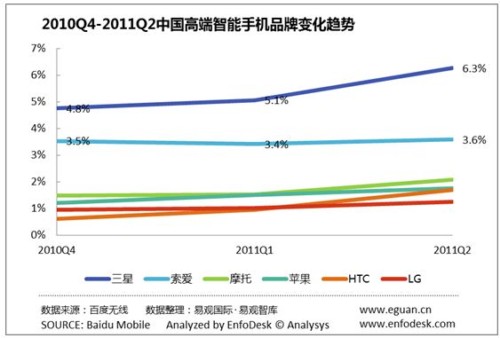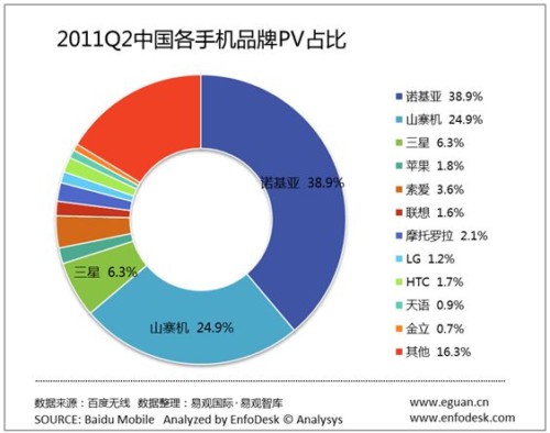 3、HTC、三星、摩托為代表的智能手機(jī)收益于Android得到快速發(fā)展。作為最早一批生產(chǎn)Android智能手機(jī)的廠商,HTC、三星、摩托羅拉等受益于Android的發(fā)展,PV份額保持增長(zhǎng)。另外,第2季度HTC、三星、摩托基于Android的新機(jī)型上市也是PV占比增長(zhǎng)的原因之一。