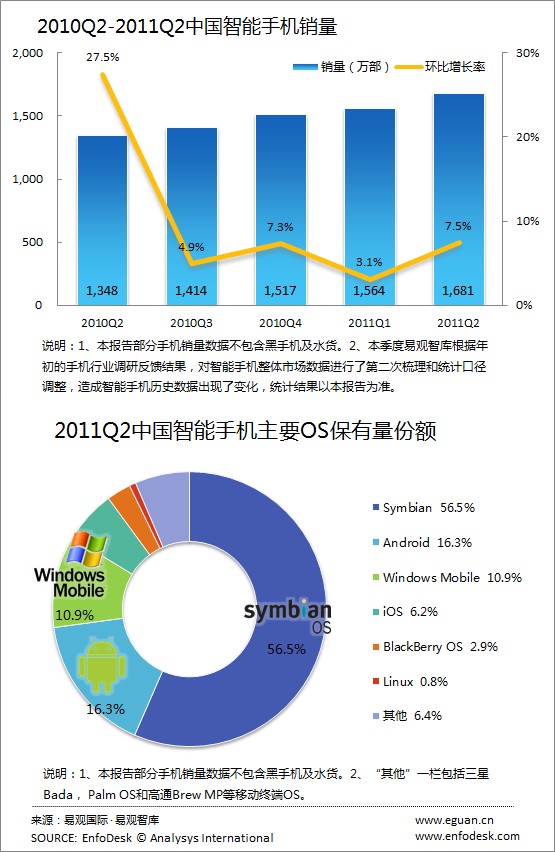 CTI論壇(ctiforum)4月29日消息(記者 潘婷婷):根據(jù)易觀智庫EnfoDesk近期發(fā)布數(shù)據(jù)顯示,中國智能手機市場2011年第2季度國內(nèi)銷售總量達(dá)1681萬部(不計黑手機和水貨手機),環(huán)比增長7.5%。