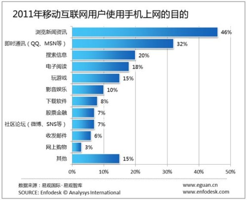 CTI論壇(ctiforum)9月1日消息(記者 潘婷婷):根據(jù)易觀國(guó)際對(duì)于中國(guó)移動(dòng)互聯(lián)網(wǎng)用戶最新調(diào)研數(shù)據(jù)顯示,2011年移動(dòng)互聯(lián)網(wǎng)用戶使用手機(jī)上網(wǎng)的目的中,瀏覽新聞資訊、即時(shí)通訊是集中度最高的兩個(gè)選擇,均占比30%以上,搜索信息、閱讀和玩游戲是用戶選擇的第二梯隊(duì),第三梯隊(duì)則是影音娛樂(lè)、下載軟件,股票金融和社交。